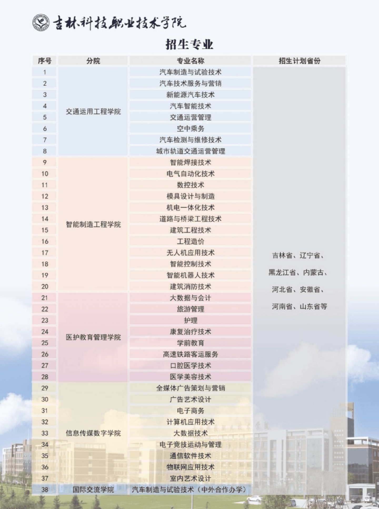 学院坐落于吉林省长春市,校园规划占地面积59万平方米,总投资4.5亿元。专业设置覆盖工学、医学、教育学、管理学、艺术学等学科,其中吉林省特色高水平高职专业群4个,在校生万余人,是莘莘学子理想的学习、生活乐园。
